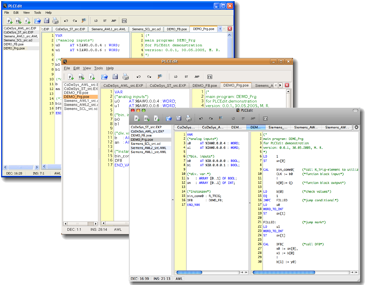 PLCEdit is an opensource PLC-programming editor to create, convert and print POU files (Program Organisation Unit). The supported coding languages are Instruction List and Structured Text, according to the IEC61131-3 standard. All POU types: main programm, function blocks, functions and global variable lists can be edited by PLCEdit. PLCEdit is aimed to user who wants a small tool like a notepad.